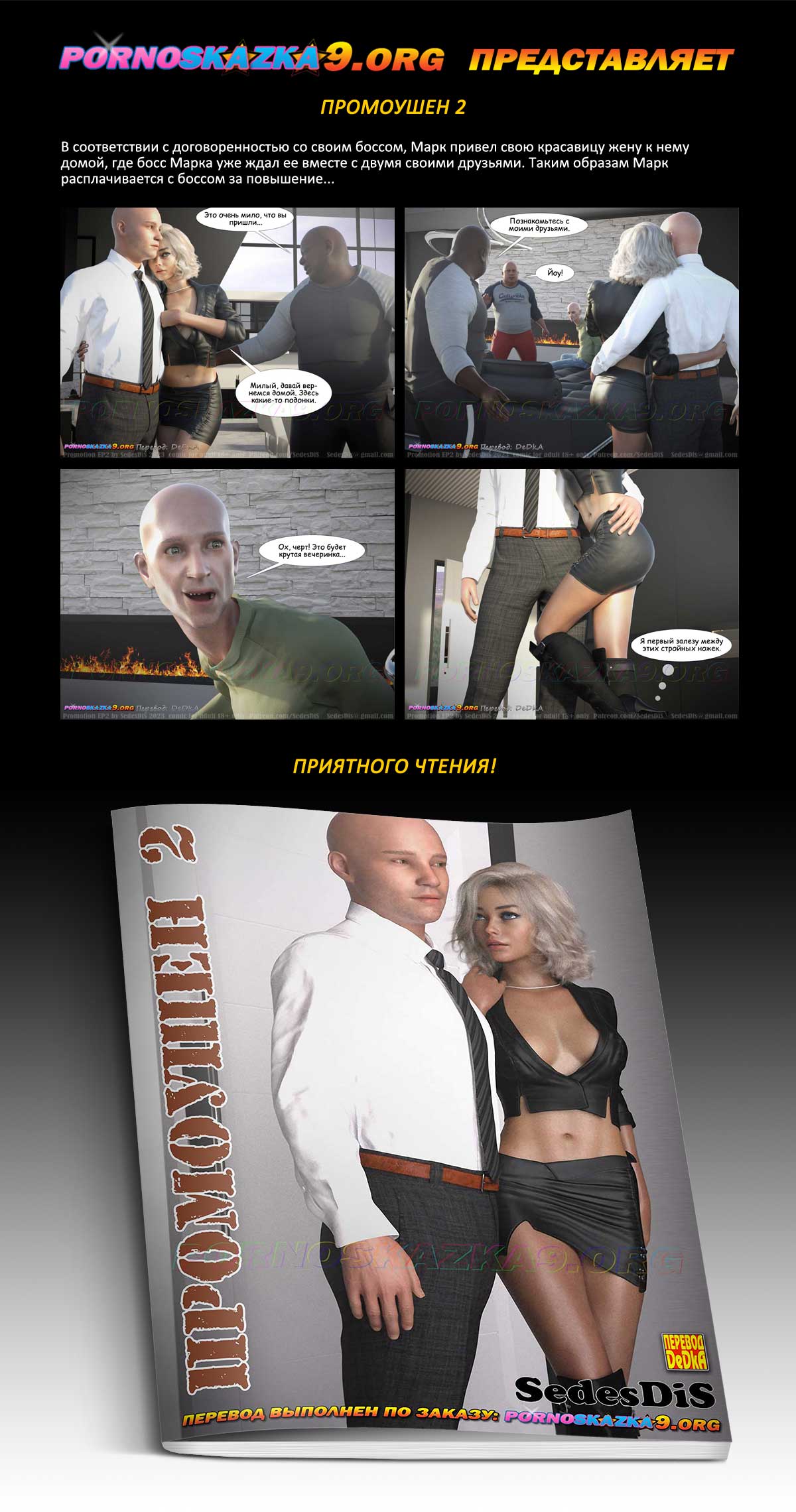 Порно комикс «Промоушен. Часть 2.» В соответствии с договоренностью со своим боссом, Марк привел свою красавицу жену к нему домой, где босс Марка уже ждал ее вместе с двумя своими друзьями. Таким образам Марк расплачивается с боссом за повышение…